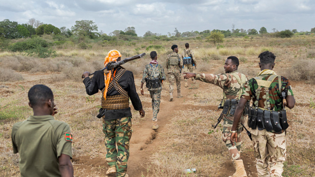 Somali soldiers walk near the frontlines at Sabiid, one of the towns they liberated from Al-Shabaab, in November 2025 [Getty]